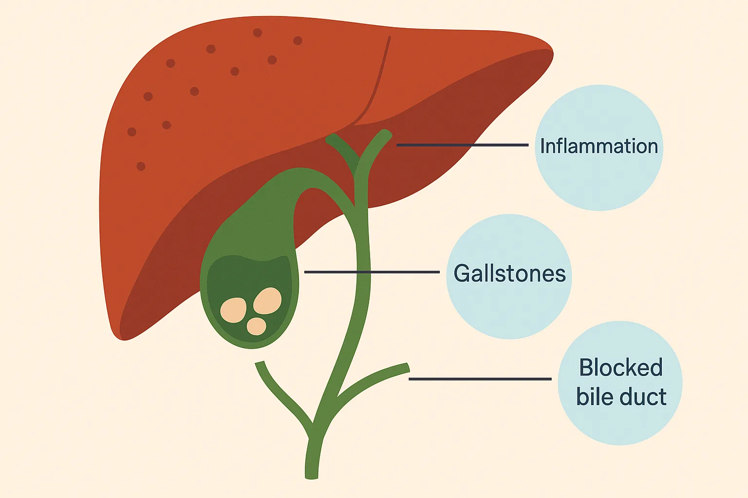 🔹 Litiază biliară – prezența calculilor (pietrelor) în vezica biliară